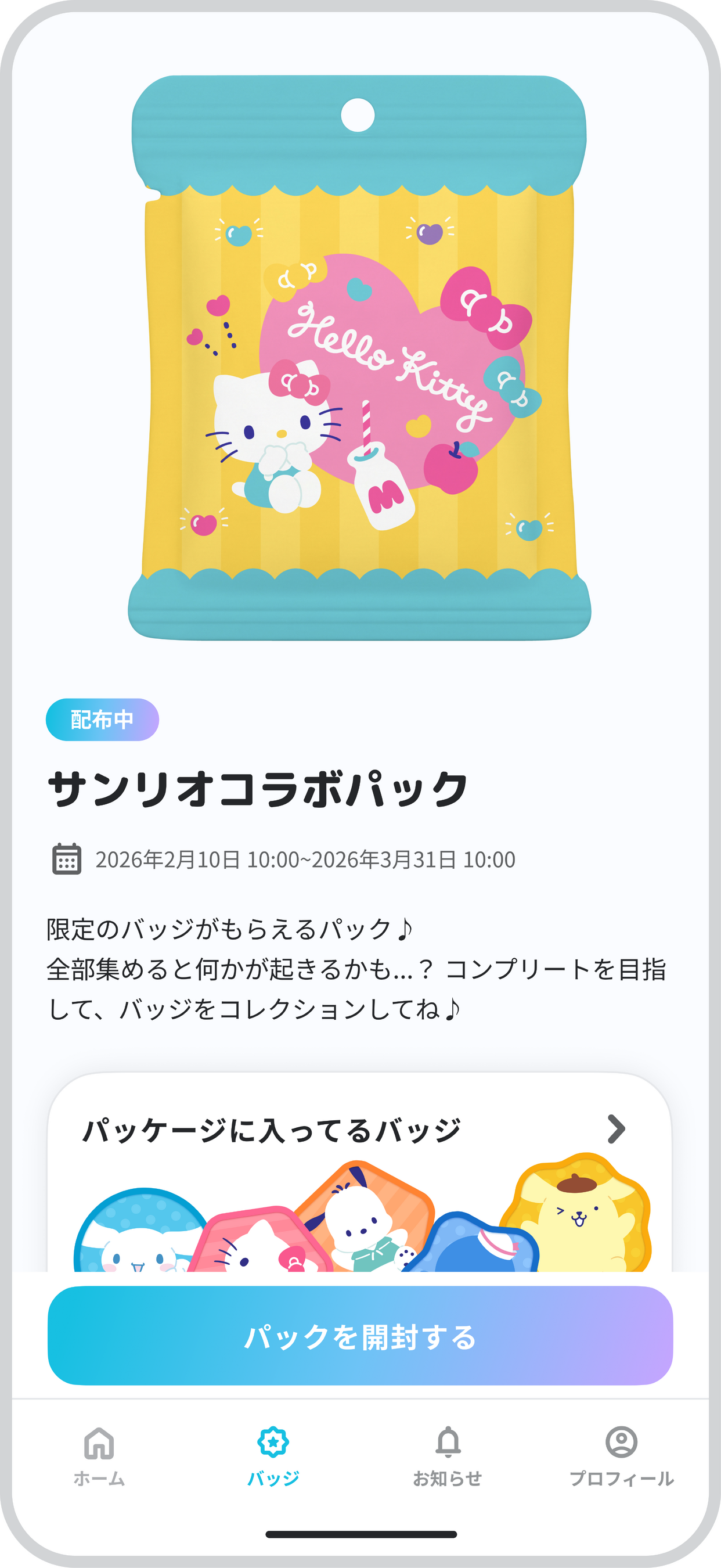 対象のイベントごとにアプリに表示される「イベントパック」からキャラクターのバッジがランダムに獲得でき、スタンプラリーのようなコレクションが可能。