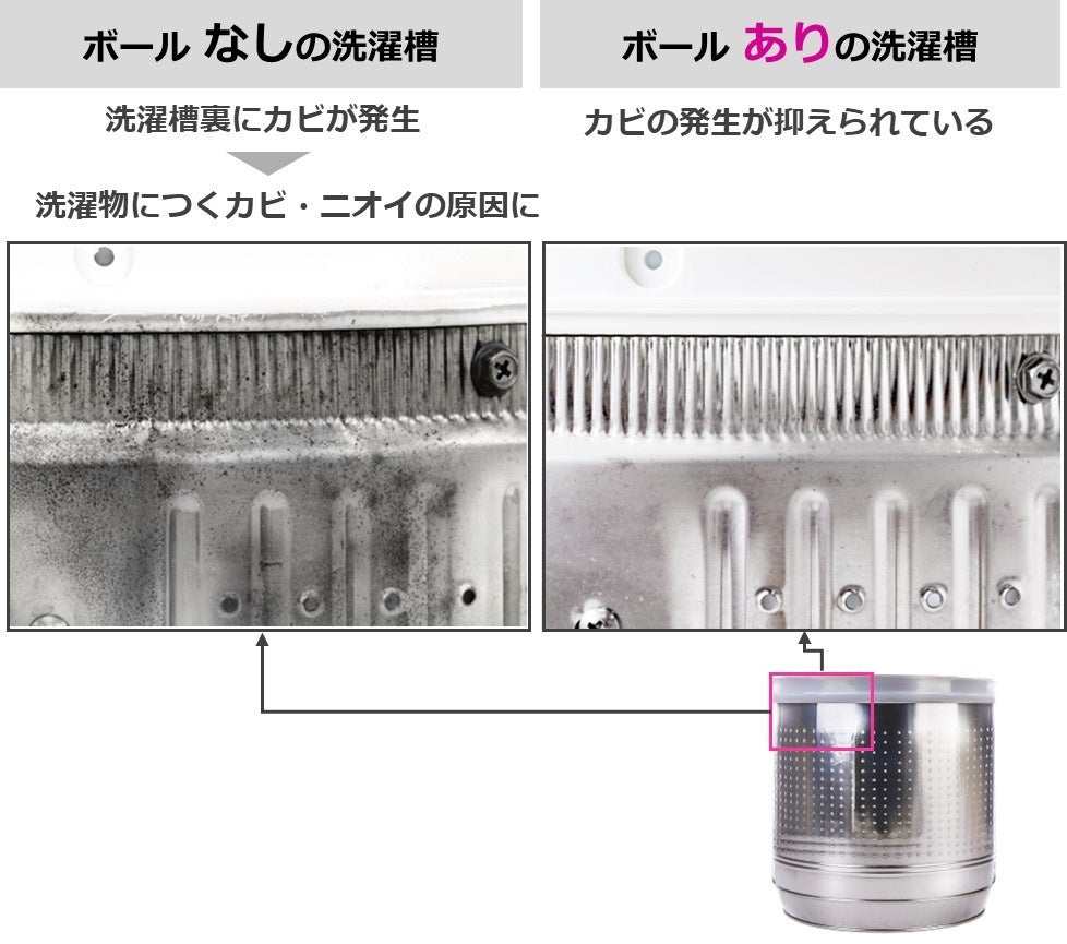 ・ボールを入れるだけで、洗濯水を抗菌水に変えることで、洗濯槽のカビ・ニオイの発生を防ぐ