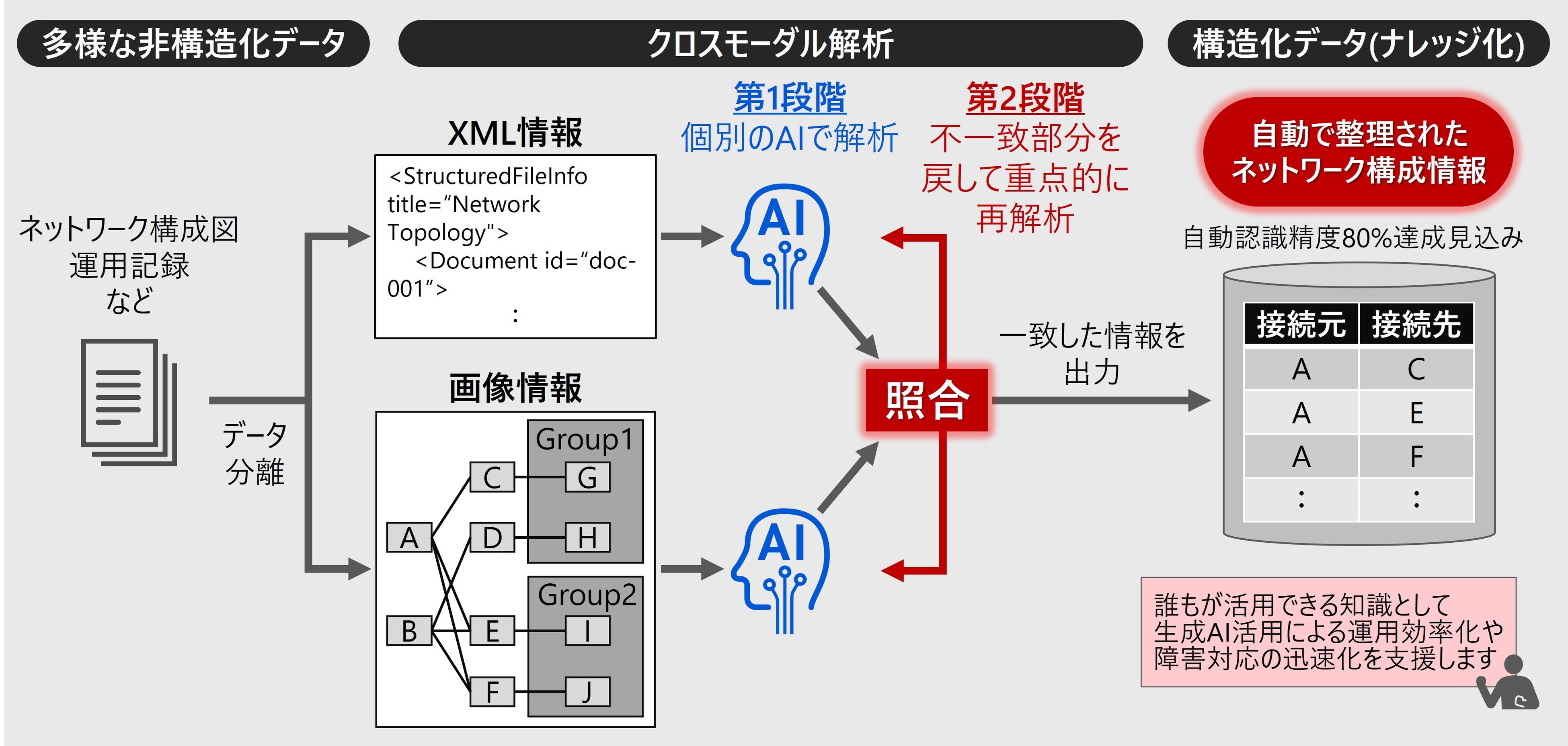 そこで日立は、ネットワーク運用・設計現場の知識やノウハウを最大限に活用し、業務の効率化や自動化を支援するAI解析技術を開発しました。本技術は、ネットワーク構成図や日々の運用記録など、形式の異なる多様な現場データを2段階のクロスモーダル解析により、自動で整理・構造化するものです。具体的には、まず第1段階ではデータ全体を広い視点で捉えるため、XML情報(ファイル内の記述内容)の解析と画像解析を個別に行います。次に第2段階では、第1段階におけるそれぞれの解析結果を照合し、照合で一致した部分はそのまま確定し、不一致となった部分についてはより細かく注目する範囲を絞ることで、認識精度を高めます。今回、公開ネットワークモデルのJPNMで本技術の効果を検証したところ、図形の関係性を正確に認識するとともに、見逃しや思い込みによる誤認識を防ぎ、従来の単一モーダル解析と比べて、ネットワーク構造図や対応記録の自動認識精度を約80%まで達成できる見込みが得られました。これにより、現場で蓄積された多様なデータを誰もが活用できる知識やノウハウとして提供し、生成AI活用による運用効率化や障害対応の迅速化を支援します。