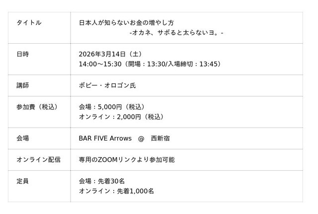 キャリアや人生における挑戦が"リスクの選択"と言われている中、本講演ではボビー氏のリアルな体験談も交えながらリスクを前向きにとらえ、自らの成長へとつなげてきた思考法についてお話しいただきます。「お金を働かせる」という視点から資産形成について考えるきっかけを得られる内容です。