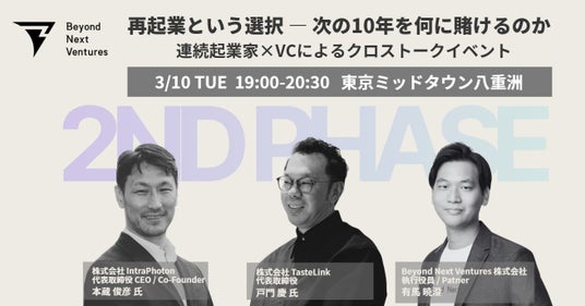 - 登壇者:株式会社IntraPhoton 代表取締役CEO 本蔵 俊彦氏、株式会社TasteLink 代表取締役 戸門 慶氏、当社 執行役員/パートナー 有馬 暁澄