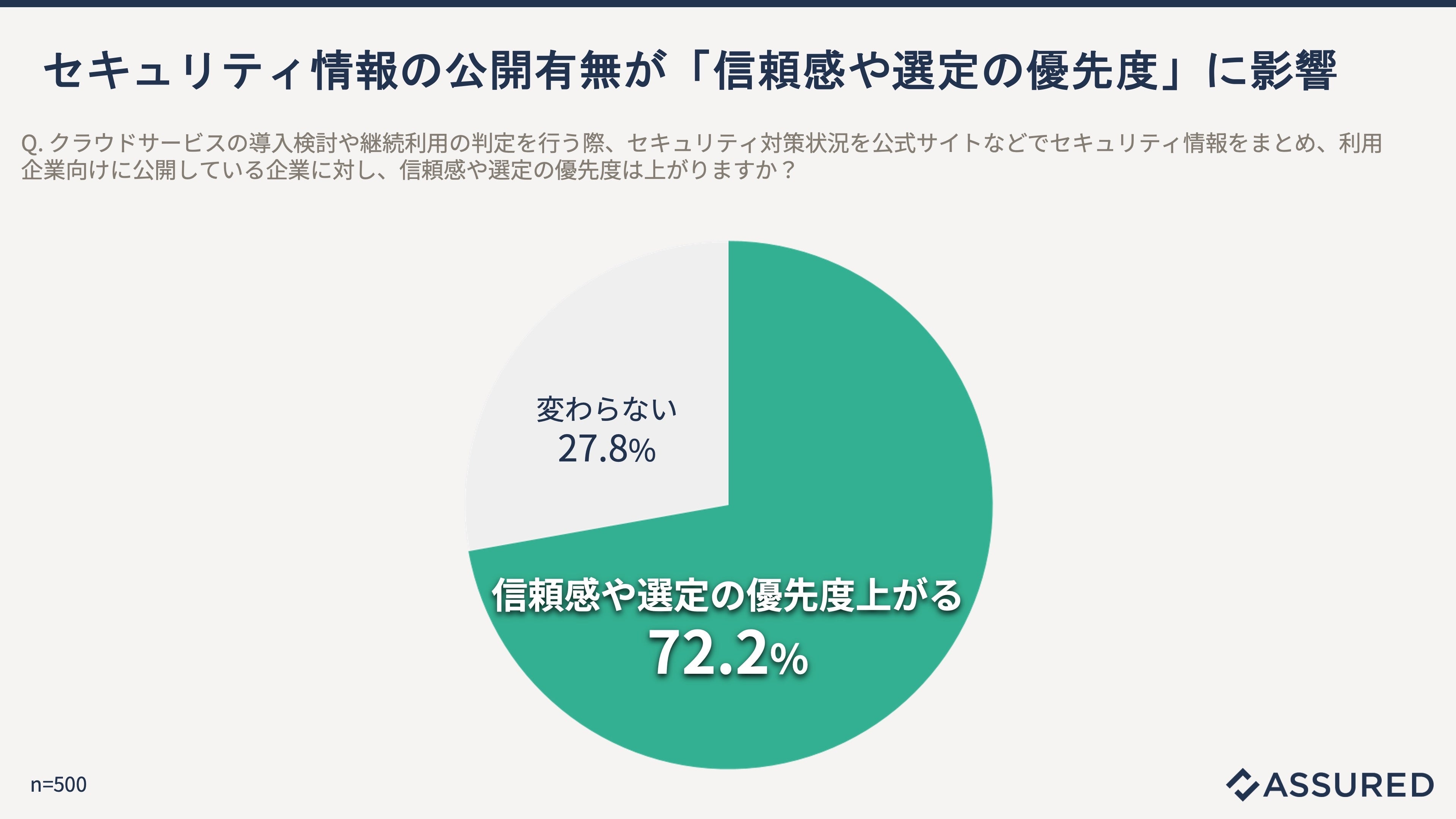 導入検討や継続利用の判定を行う際、クラウドサービス事業者の情報開示姿勢が選定を左右する傾向が強まっています。公式サイト等でセキュリティ情報をまとめ、利用企業向けに公開しているクラウドサービス事業者の姿勢に対し、検討企業の72.2%が「信頼感や選定の優先度が上がる」と回答しました。自ら情報を開示する透明性の高さは、選定における重要な指標の1つとなっている実態が伺えます。