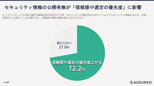株式会社アシュアード(本社: 東京都渋谷区、代表取締役社長: 大森厚志)が運営するセキュリティの信用評価プラットフォーム「Assured」は、従業員数1,000名以上の大手企業に所属する情報システム・セキュリティ部門の方500名を対象にクラウドサービスの利用の際の公開情報の確認状況やサービス選定への影響について、セキュリティの情報開示に関する実態を調査しました。