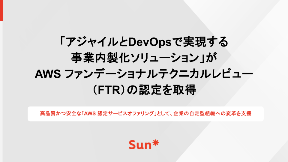 株式会社Sun Asterisk(本社:東京都千代田区、代表取締役:小林 泰平、以下「Sun*」)は、Sun*が提供する「アジャイルとDevOpsで実現する事業内製化ソリューション」がアマゾン ウェブ サービス(以下「AWS」)の技術審査「AWS ファンデーショナルテクニカルレビュー for Service Offerings」を通過し、「AWS 認定サービスオファリング」として登録されたことをお知らせします。