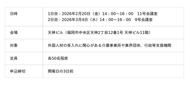 本プログラムは、海外国人介護人材の受入れを検討している企業と、日本での就業を希望する海外国人材の双方にとって有益な機会を提供いたします。1.企業向け情報意見交換会