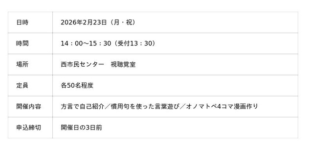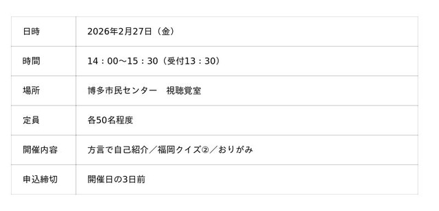 日本語特有の表現を学ぶワークショップや、福岡の文化に関するクイズ、4コマ漫画作りなどを通じて相互理解を深めます。