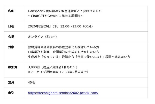 10代向けデジタル人材育成サービス『TechHigher』を運営する株式会社エクシード(本社:東京都渋谷区、代表取締役:澤部愛子)は、ライセンス提携校であるタイ・バンコクの「AI&プログラミングのKOBEYA」(代表:鈴木政路)を講師にお迎えし、「”Gensparkを使い始めて教室運営がこう変わりました”~ChatGPTやGeminiに代わる選択肢~」を、2月26日(木)12:00~13:00(60分)にオンライン開催することをお知らせします。