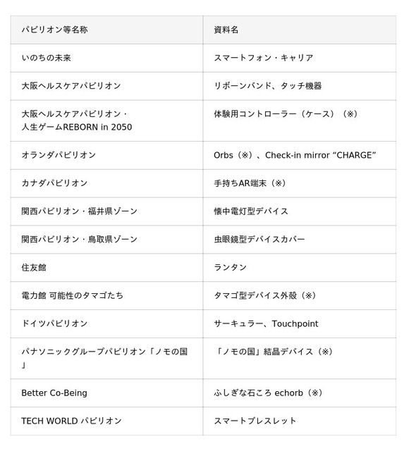 デバイスは原則として、それぞれのパビリオンの中で体験が完結され持ち出されることがなかったため、直接比較できるのは初の機会となります。パビリオンのミッションや企画、思想に基づいたデバイスの造形をご覧いただき、それらの機能を解説します。