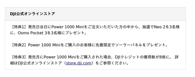 DJI Power 1000 Miniの希望小売価格(税込)は53,460円で、DJI公式オンラインストア(store.dji.com)および正規販売代理店よりご注文いただけます。また、DJI公式オンラインストアおよびその他の一部販売店では、発売時に期間限定のプロモーションセールが実施されます。詳細は各販売店にてご確認ください。以下ではDJI公式オンラインストアまたAmazonでのプロモーションについてご紹介いたします。