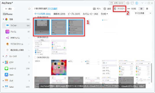 Step 3:転送したい写真を、画面上部の「デバイスへ」ボタンから転送先の iPhone に指定します。複数選択や全選択にも対応しているため、大量の写真もまとめて選択できます。