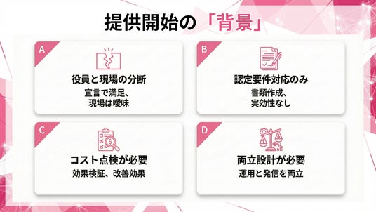 認定制度は見える化と社会的評価を目的としているため、要件適合と運用定着を同時に整備することで、社外発信に耐える一貫性と社内の実効性を両立します。