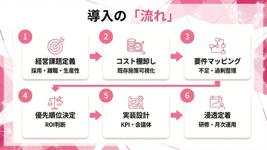 - 既存コスト棚卸し(福利厚生/研修/委託費/産業保健体制)と、目的・対象・効果・測定の可視化