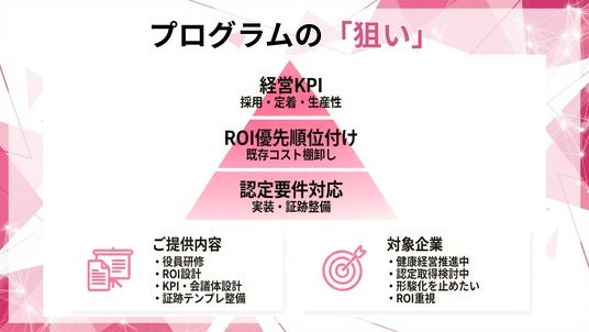 本支援は、健康経営を投資として捉え、経営課題起点でROI優先順位付けを行い、認定要件への適合と実行運用(方針・KPI・会議体・証跡)を一本化するエグゼクティブ研修・実装支援です。