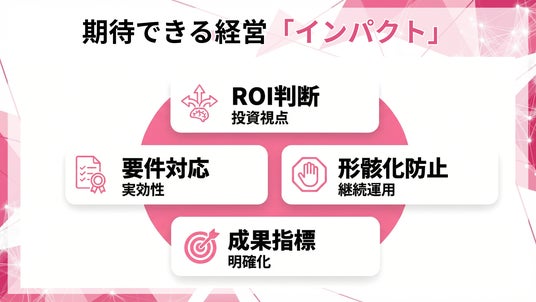 本支援は、役員の意思決定と現場運用の共通言語を整え、認定要件対応とROIの両立を前提に、方針・KPI・会議体・証跡の設計まで一気通貫で実装します。