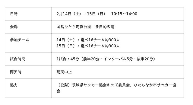 国営ひたち海浜公園の「多目的広場」では、2月14日(土)・15日(日)に「海・花ちびっこサッカー大会U-12」を開催します。本大会は6年生の卒団シーズンにあわせ、これまで培ってきた技術やチームワークを発揮する場として、心に残る思い出づくりを目的に開催されるものです。試合当日は、子どもたちがこれまで積み重ねてきた成果を発揮し、白熱した試合の数々をご覧いただけます。