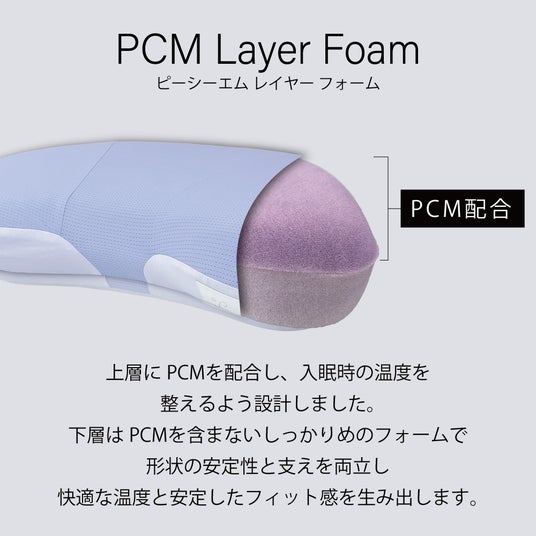 本製品では、温度変化を穏やかに整えるPCM(相変化素材)を配合したウレタンフォームを採用。温度が上がりすぎると熱を吸収し、下がるとゆるやかに放出する性質を活用し、入眠時の温度変化を妨げない環境づくりを目指しました。
