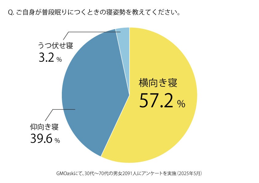 GMOaskで2025年4月に実施した、30~70代男女2,091人を対象とする調査によると、57.2%が「横向きで寝る」と回答しました。仰向け寝は39.6%、うつ伏せ寝は3.2%という結果となり、横向き寝が過半数を占める実態が明らかになりました。