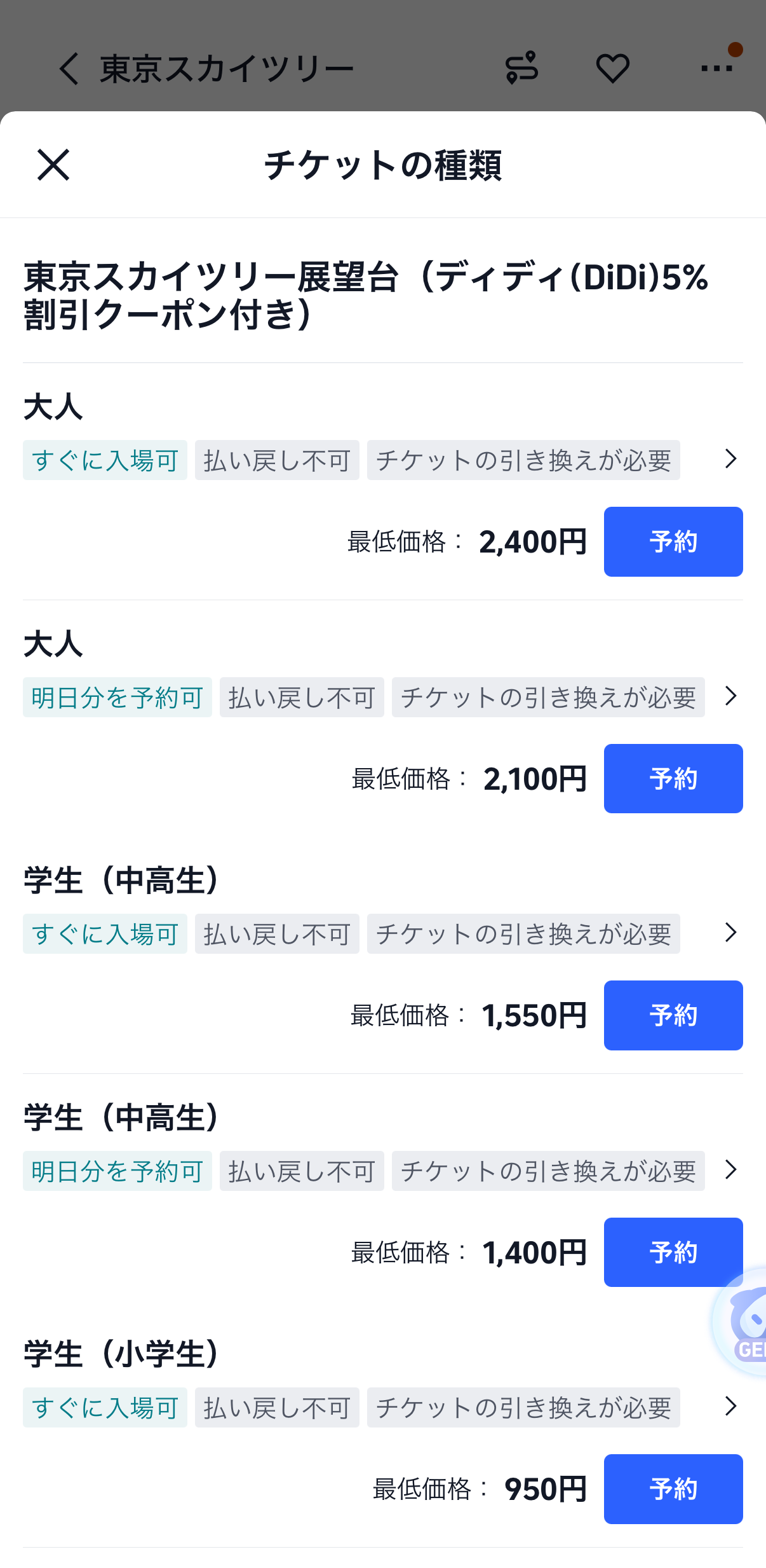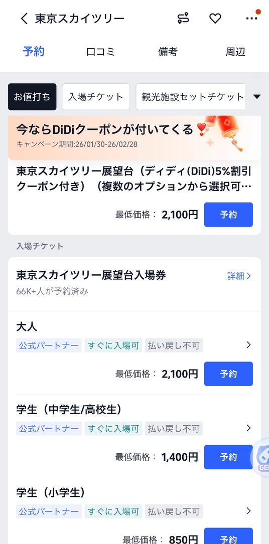 キャンペーン期間中、Trip.comで「東京スカイツリー」、「ワーナー ブラザース スタジオツアー東京 - メイキング・オブ・ハリー・ポッター」等、対象チケットを購入すると、誰でも利用できるDiDiの「5%OFF(最大500円)」クーポンコードを提供します。