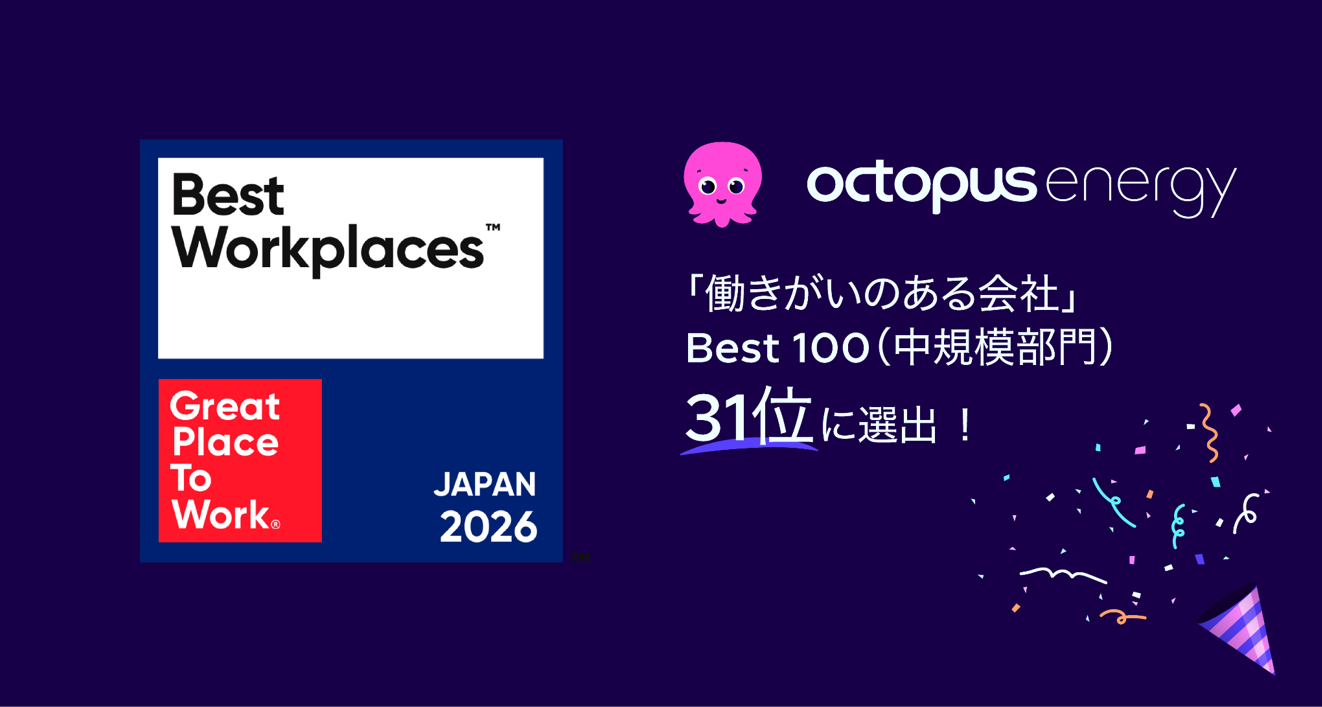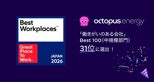 2022年から1137%の成長を遂げ、電力会社上位40社の中で成長率第1位を記録した[1]オクトパスエナジーは、テクノロジーの力でより環境価値の高いエネルギーを魅力的な価格と斬新なサービスで提供しています。このたび、Great Place To Work(R) Instituteの日本法人であるGreat Place To Work(R) Institute Japan(以下「GPTWジャパン」)が発表する2026年版「働きがいのある会社」ランキングにおいて、Best 100(中規模部門/100~999人)31位に選出されました。
