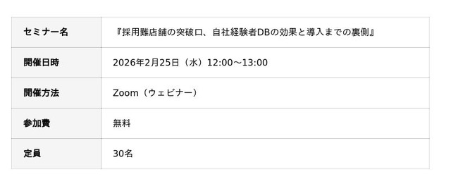RPO(採用業務代行)・採用コンサルティングを行う株式会社ツナググループ・ホールディングス(本社:東京都中央区、代表取締役兼執行役員社長:米田光宏)は、2026年2月25日にオンラインセミナー『採用難店舗の突破口、自社経験者DBの効果と導入までの裏側』を開催します。