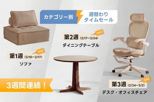 新生活に欠かせない大型家具を対象に、3週間連続・週替わりで実施するタイムセールを開催します。 期間中は、各週ごとに異なる家具カテゴリーをピックアップし、期間限定の特別価格でご提供します。