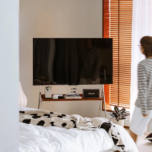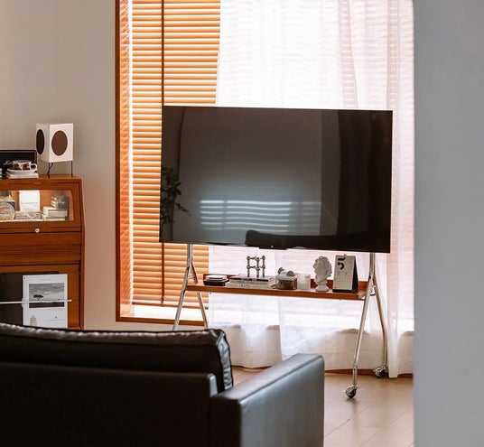 キャスター付きで自由に移動できる可動式テレビスタンド。静音キャスターを採用し、床を傷つけにくく、ストッパー付きでしっかり固定することも可能です。46~65インチのテレビに対応し、高さや位置を調整することで、視聴環境に合わせた快適な使い心地を実現。FAS級のツゲ材とステンレスフレームを使用し、耐久性と美しさ、安定感を兼ね備えています。