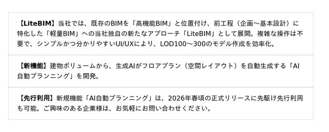 - 【LiteBIM】既存の高機能BIMソフトをリプレイスするのではなく、棲み分けとしてその前工程(企画・概念設計・基本設計)を担います。LOD100~300のモデルを手軽に作成し、IFCで既存BIMへ連携します。