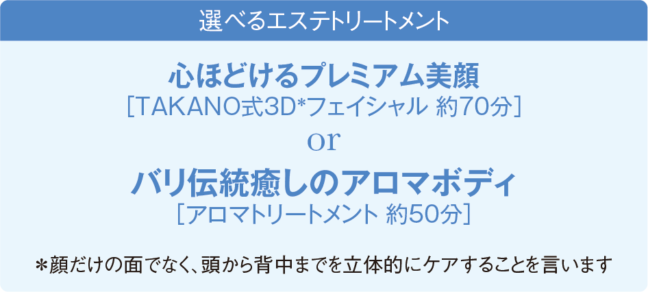 下記のフェイシャルまたはボディコースのいずれか1コースをお選びいただけます。■フェイシャルコース心ほどけるプレミアム美顔