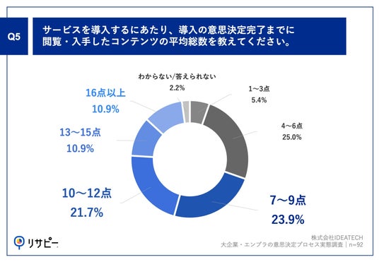 エンタープライズ開拓では、社内の関係者に説明して納得を取る場面が増えるため、「なぜこの提案なのか」を示す根拠が欠かせません。実際、導入の意思決定までに閲覧・入手したコンテンツは7点以上が約7割で、複数の材料をそろえて判断している様子が見えます。だから本資料には、マーケティングだけでなく営業でも社内説明に使える根拠を組み込みます。