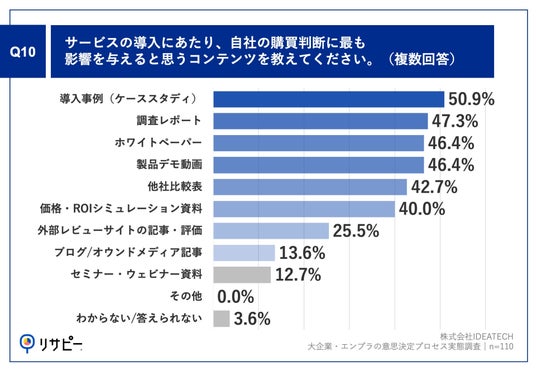 そして重要なのが、「購買判断に影響を与えるコンテンツ」の中で、導入事例(50.9%)に次いで、調査レポートが47.3%と上位に入っている点です。大手ほど、社内を動かすために“説明できる根拠”が必要になり、調査データを含む資料が求められやすい構造があります。