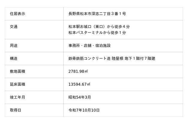 松本市は、国宝松本城をはじめとする豊かな歴史文化と、上高地や美ヶ原高原への玄関口として、国内外から多くの観光客が訪れる国際観光都市です。 当社は、地域経済の活性化と松本駅前エリアの新たな賑わい創出を目指し、長年にわたり地域の皆様に愛された旧井上百貨店の跡地活用について検討を重ねてまいりました。この度、世界的なブランド力と顧客基盤を持つマリオットと提携し、従来のビジネスホテルや旅館とは一線を画す、松本市初の外資系ホテルを開業する運びとなりました。