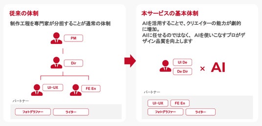 AI活用により、各分野の担当者が入れ替わる分業制を捨て、1~2名の専属クリエイターが直接顧客と向き合う体制を構築することができます。