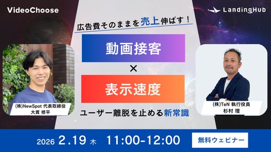 株式会社TeN(本社:東京都渋谷区、代表取締役:廣瀬 由典)が提供する表示速度改善ツール「LandingHub(ランディングハブ)」は、NewSpot株式会社(本社:東京都渋谷区、代表取締役:大貫 修平)が提供する動画接客ツール「VideoChoose」と共同で、オンラインセミナーを2026年2月19日(木)に開催します。