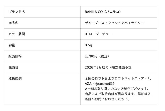 「BANILA CO」は全国のロフト・PLAZA・@cosmeほかにて、新商品「デューブーストクッションハイライター」を販売開始します。