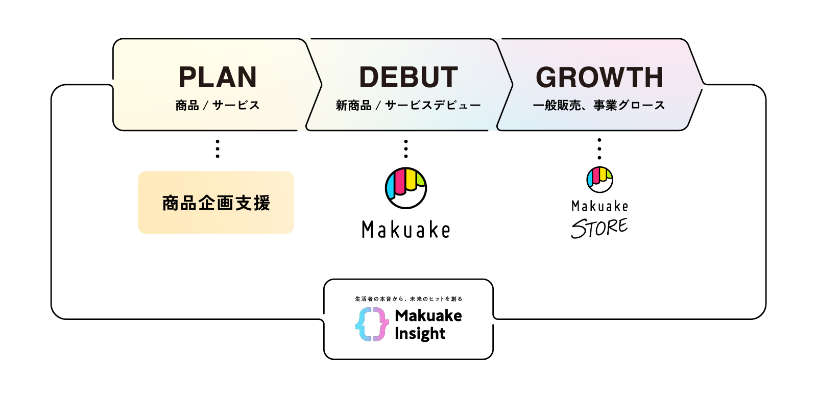 マクアケでは現在、新商品・サービスのデビューのプラットフォームである「Makuake」(DEBUT)サービスに加えて、「Makuake」前の商品企画支援等のPLANフェーズの支援、「Makuake」後の一般販売・事業成長支援のGROWTHフェーズの支援としてEC販売・プロモーション・物流をマクアケが代行し、販路拡大を支援する「Makuake STORE for ECモール」、そして生活者の声とデータを活用した事業者向けリサーチサービス「Makuakeインサイト」サービス等を展開しています。