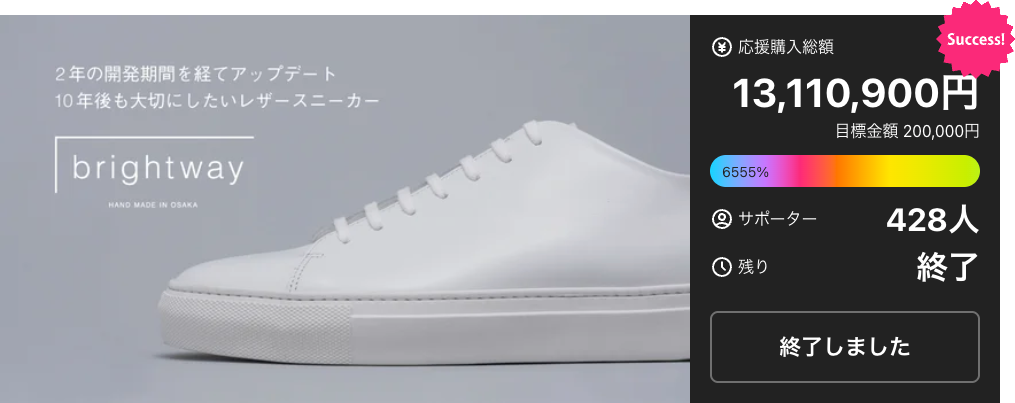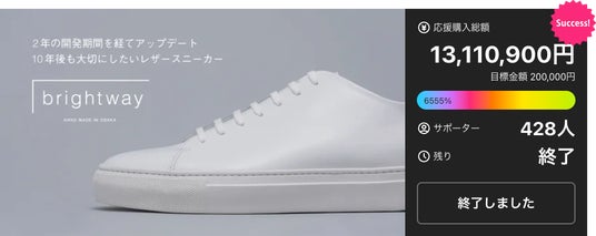 自社ブランドである「brightway」デビューの際に「Makuake」実施。婦人靴ブランドのOEMで培った技術力で、フォーマルでもカジュアルでも履けるレザースニーカーを発売。「Makuake」実施後は、百貨店での取り扱いや多くのコラボレーションをするなど、自社ブランドとしても大きな成長を遂げています。