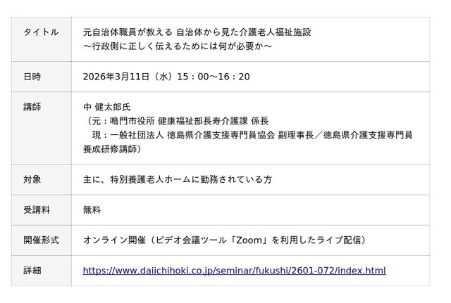 本セミナーでは、元自治体職員であり、介護現場・経営の両方を知る講師が、