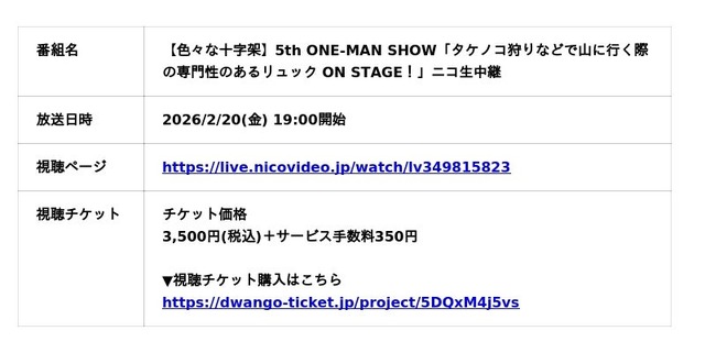 【色々な十字架】5th ONE-MAN SHOW「タケノコ狩りなどで山に行く際の専門性のあるリュック ON STAGE!」ニコ生中継