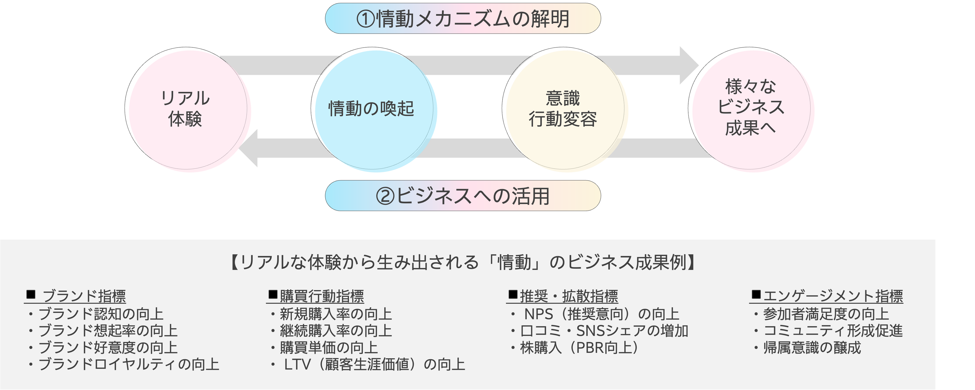 体験で人の気持ちが強く動く「情動」のメカニズムに科学的・学術的にアプローチし、体験→情動の喚起→行動変容→ビジネス成果という一連の仕組みをモデル化し、リアル体験の価値を新たなビジネス開発に活用する。