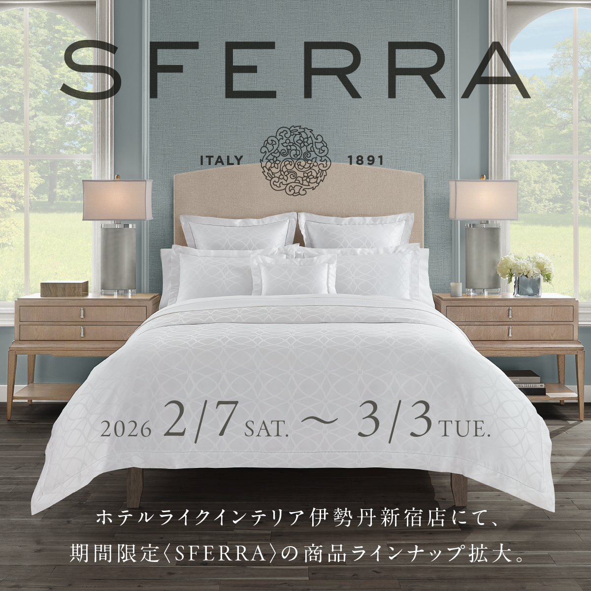 ホテルライクインテリア 伊勢丹新宿店では、2026年2月7日(土)~3月3日(火)まで、〈SFERRA(スフェラ)〉の商品ラインナップを期間限定で拡大展開いたします。