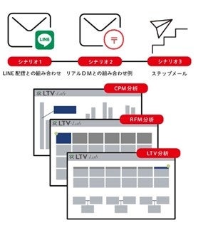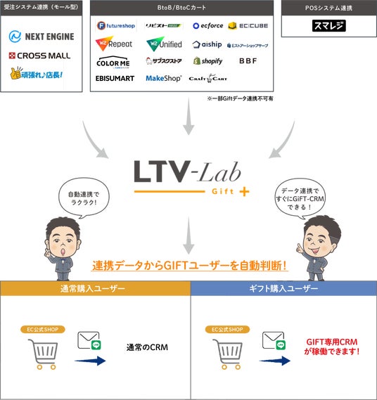 Gift機能搭載通販向けCRM「LTV-Lab with Gift」は主要ECカートと標準連携。連携データからGiftユーザーを自動判断し、送り主と送付先を適切に管理。Gift商品のシーズン毎の継続・離脱防止施策、自家需要促進、継続分析が可能な費用対効果の高いGift-CRMです。さらに顧客管理から分析、自動メール配信/ステップメール配信(LINE配信も可能)、顧客の購入商品や金額、購入期間などの分析から顧客をセグメントして、最適な顧客にメール配信やステップメール配信(無制限)を行うことができます。
