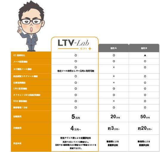 どんなに高くていいツールを入れても、それに見合った収益が出なければ、費用対効果が合いません。「LTV-Lab with Gift」の価格は、初期費用が5万円、月額費用は4万円から。メールの配信通数やシナリオの設定数に上限はありません。メールもLINEも配信アドレスによって月額料金が変わる。会員登録数や配信通数ではなく有効アドレス数での課金のため、メルマガを送れば送るほど費用対効果が良くなる料金設定です。メルマガの設定を解除した顧客がいれば、次の月には課金の人数から外れる仕様になっています。