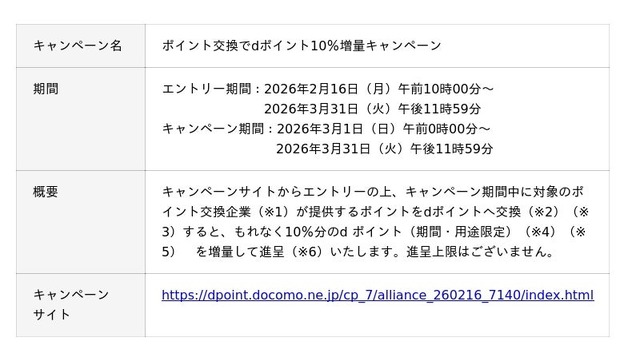 本キャンペーンの参加にはエントリーが必要で、エントリーは2026年2月16日(月)から受付開始いたします。キャンペーン期間中、対象企業のポイントをdポイントへ交換(※2)(※3)することで、もれなく10%分のd ポイント(期間・用途限定)(※4)(※5)を増量して進呈(※6)いたします。進呈上限はございません。