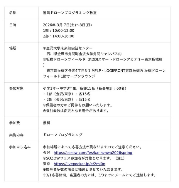 本イベントは、「SOZOWフェス Kanazawa 2026 Spring with 金沢大学」が開催される金沢大学未来知実証センターと板橋ドローンフィールド(KDDIスマートドローンアカデミー東京板橋校)の2拠点で実施し、それぞれ対象は小学1年生から中学3年生までの参加者を各回15名募集します。(注1)