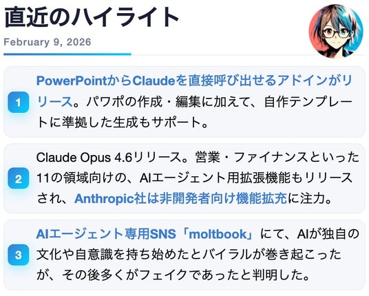 動画生成AI「NoLang(ノーラン)」をはじめとした先端的なAIプロダクト開発を手掛ける株式会社Mavericks(本社:東京都文京区、代表取締役:奥野 将太)は、購読者数8.5万人を突破した国内最大級※の生成AIメルマガ『Mavericks AI ニュース』の最新号(2月9日配信)を公開しました。