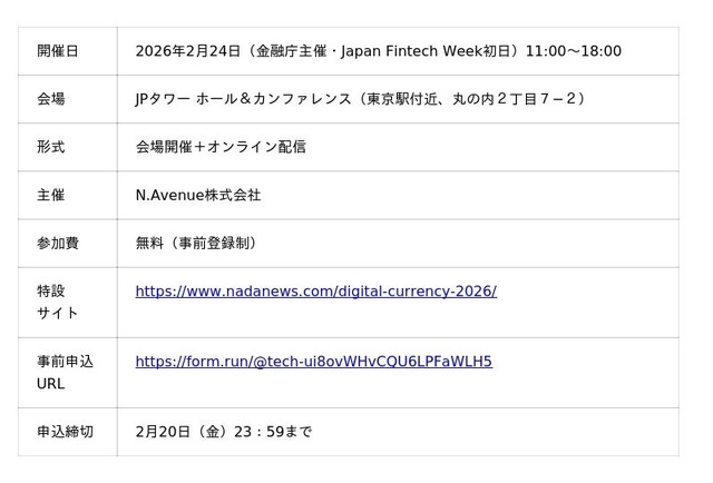 N.Avenue株式会社(NADA NEWS)は、金融庁が2月24日(火)~3月6日(金)まで主催する「Japan Fintech Week 2026」の開催日初日にあわせて、2026年2月24日(火)「デジタル通貨カンファレンス 2026(FUTURE OF DIGITAL MONEY)」を開催いたします。