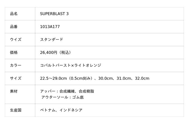 今回発売する商品は、厚みがありながらも軽量かつ反発性に優れた「SUPERBLAST」シリーズの最新作です。世界のトップアスリートからも高い評価を受けており、ペース走やジョグといったデイリートレーニング用のほか、大会に出場するランナーのレース用としてもおすすめです。