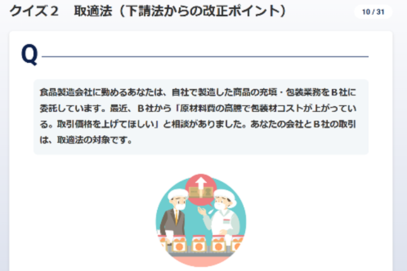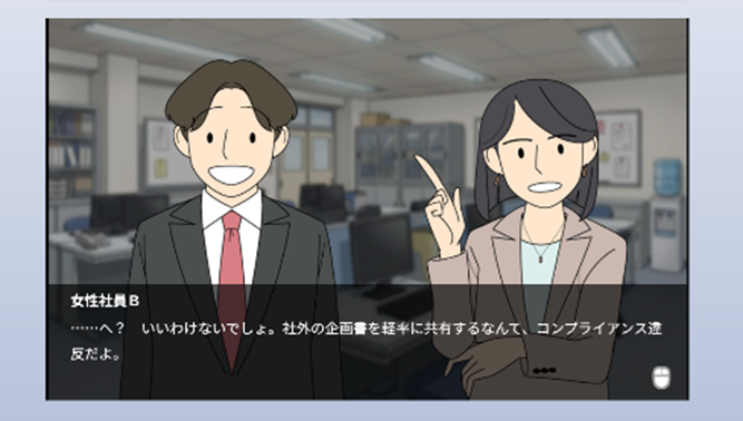 本研修では、「前年のコンプライアンス違反事例」「最新の法改正情報」「日常業務に即したクイズ」を通して、コンプライアンス違反が企業にとってどのような経営リスクにつながるのかを確認し、日常業務の判断シーンを想定したクイズで学習します。