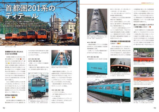 追想201(巻頭グラフ)/201系T102編成のディテール/201系直流通勤型電車のプロフィールとメカニズム/チョッパ制御の歴史と仕組み/201系の形式と番代/首都圏201系のディテール/首都圏201系の足跡/関西圏201系の足跡/203系直流通勤型電車/運転士から見た201系