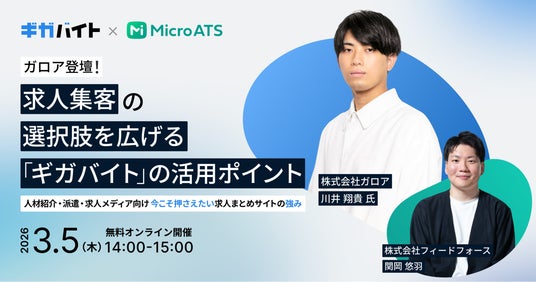 株式会社フィードフォース(所在地:東京都港区、代表取締役:塚田 耕司、以下「フィードフォース」)が提供するデータフィード管理ツール「dfplus io」は、無料オンラインセミナー「人材紹介・派遣・求人メディア向け 求人集客の選択肢を広げる「ギガバイト」の活用ポイント 今こそ押さえたい求人まとめサイトの強み」を 2026 年 3 月 5 日(木)に開催いたします。